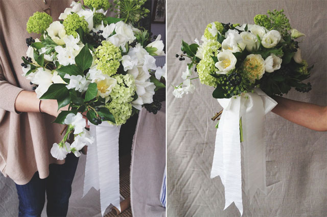 Even though it doesn't feel like spring today, as the snow continues to fall, this bridal bouquet from last weekend's wedding of ivy, sweet peas, tulips, viburnum, queen anne's lace and garden roses sure felt like spring. Wishful thinking in the middle of March. Ps. wait till you see the real photos from this wedding (to. die. for.)